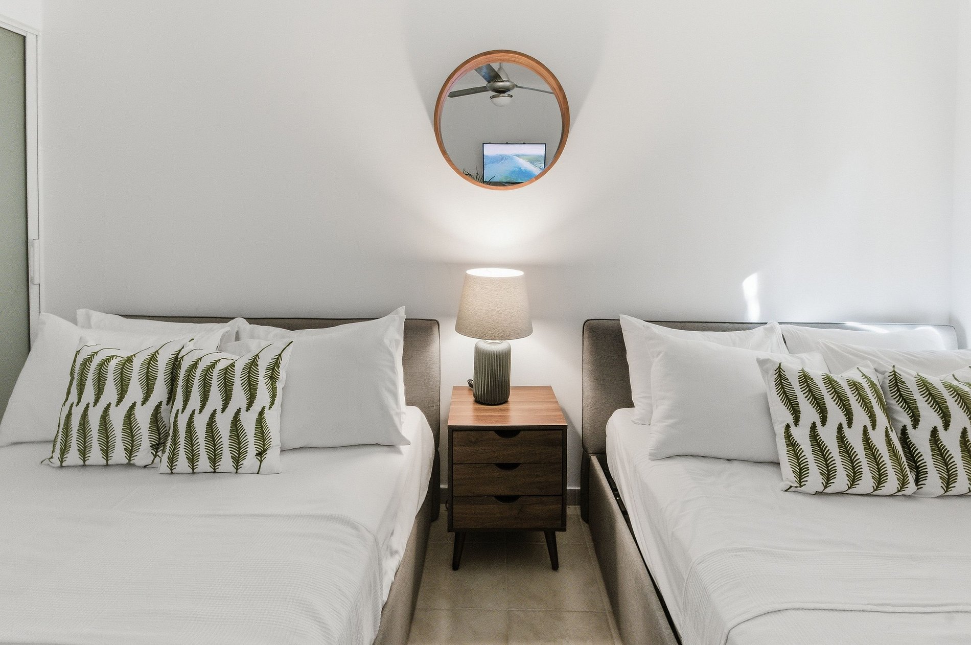 You’ll enjoy a second-floor apartment with minimalist decor that blends simplicity and comfort. Its functional design includes a fully equipped kitchen, bright and comfortable bedrooms with air conditioning and ceiling fans, and a balcony where you can relax and enjoy the residential atmosphere.
