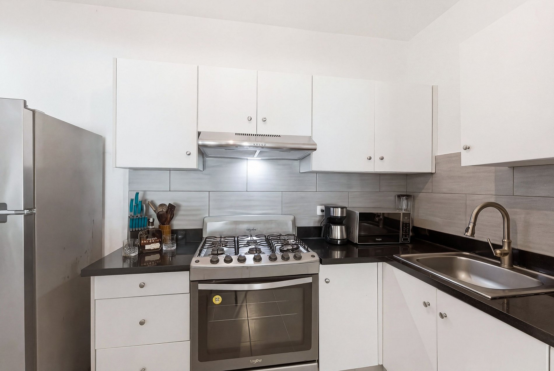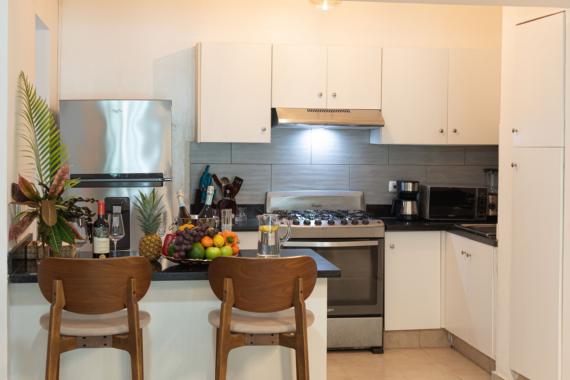 A minimalist and functional space to enjoy in Bávaro. This apartment features 2 bedrooms, a fully equipped kitchen, a private terrace, and air conditioning. Located on the second floor of Retiro Bávaro, it offers tranquility just steps from the vibrant Bibijagua Beach, known for its water activities, bars, and restaurants. Ideal for couples or families.