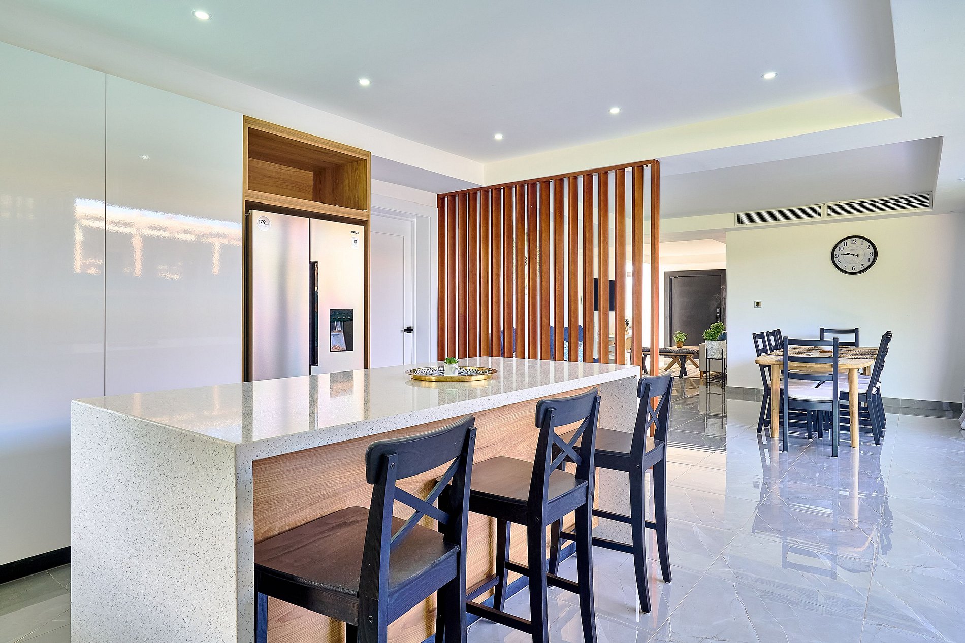 Inside, the villa offers a spacious and modern design, featuring four bedrooms, each with a private bathroom, ensuring comfort for everyone. The living and dining areas are designed for group gatherings, and the fully equipped kitchen allows guests to prepare meals just like at home. Plus, staying in Vista Cana means enjoying an exclusive and secure environment with artificial lakes, an illuminated golf course, eco-trails, and on-site restaurants.