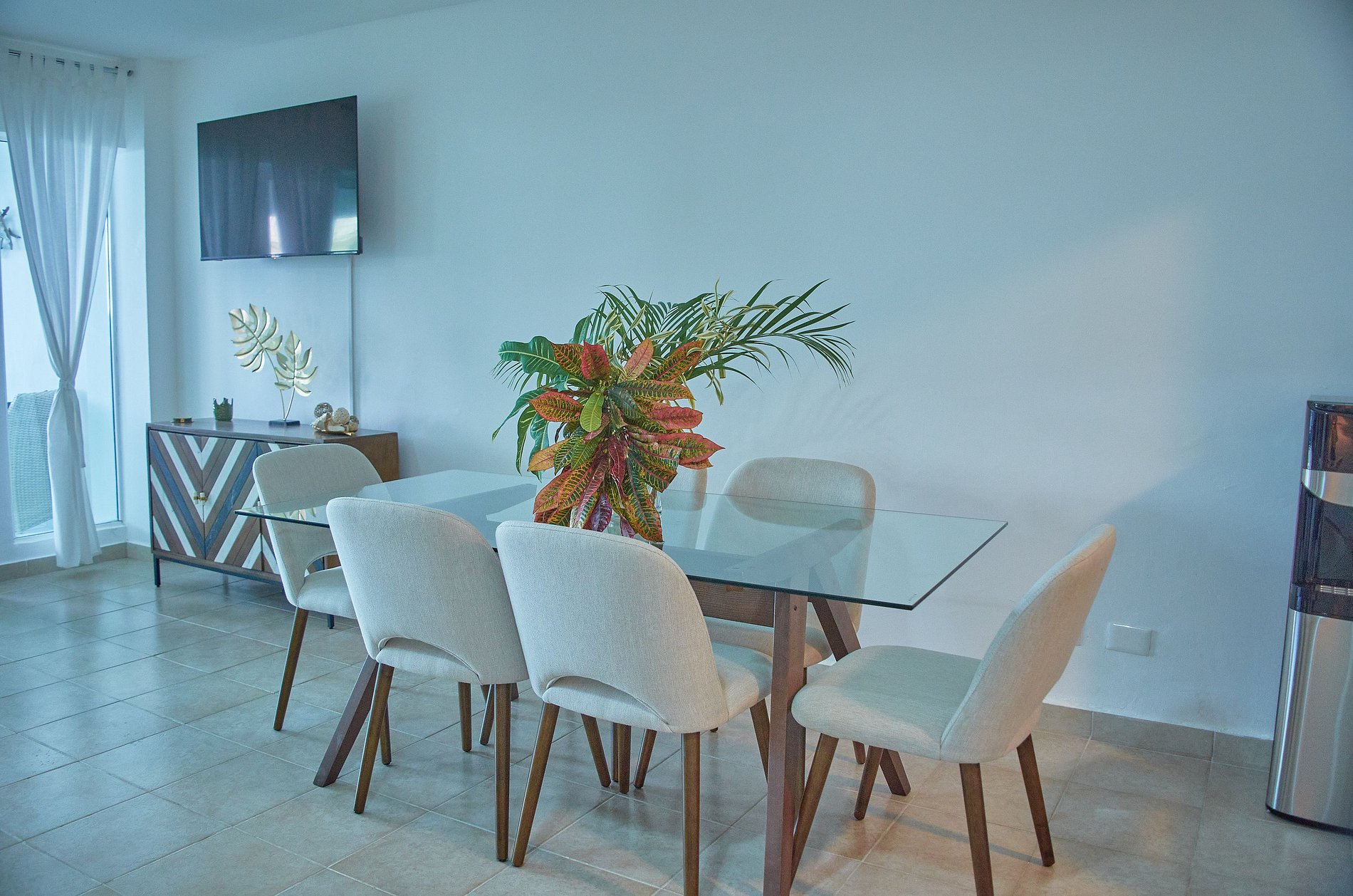 En el corazón de Bibijagua, el apartamento B103 es un espacio moderno diseñado para el confort y la comodidad de nuestros huéspedes. La decoración en tonos tierra, gris y azul oscuro crea un ambiente elegante y acogedor. La cocina, completamente equipada, invita a los huéspedes a preparar deliciosas comidas caseras, mientras que las áreas exteriores, como el balcón y la terraza, son perfectas para disfrutar de momentos de tranquilidad o una agradable charla bajo el cielo tropical.