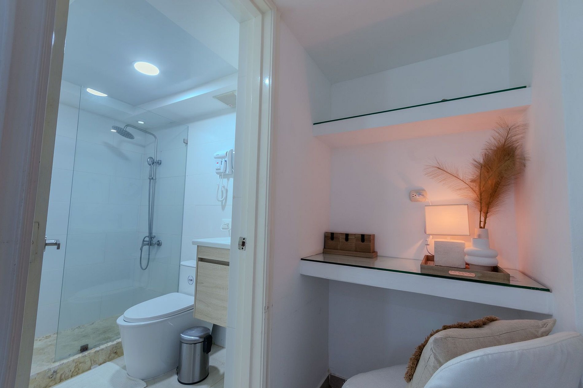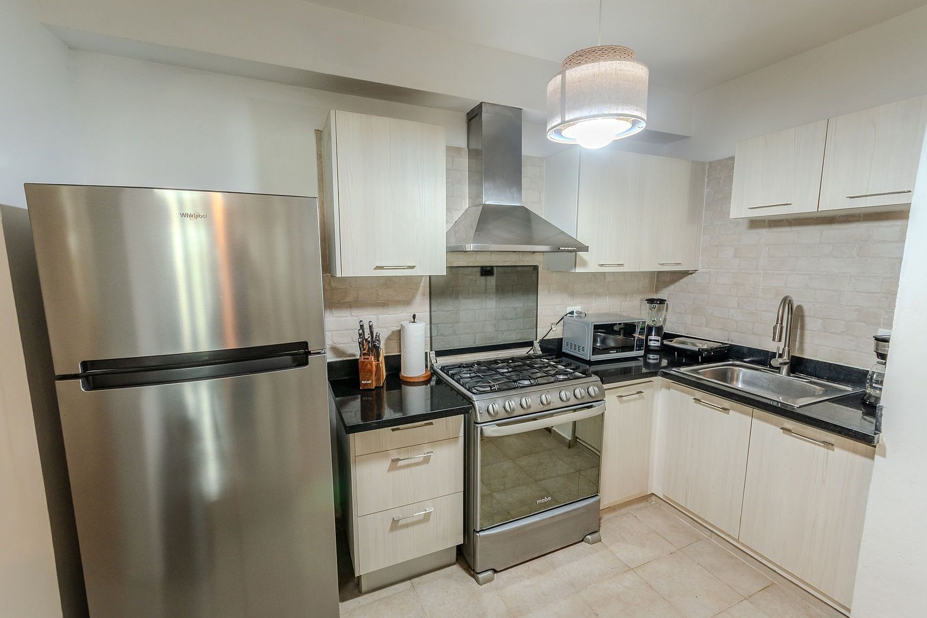 Escápate a un espacio de diseño fresco con tonos marinos y turquesas que invitan a relajarte desde el primer momento. Este acogedor apartamento cuenta con 2 habitaciones, cocina completamente equipada, terraza amoblada y aire acondicionado en todas las áreas.
