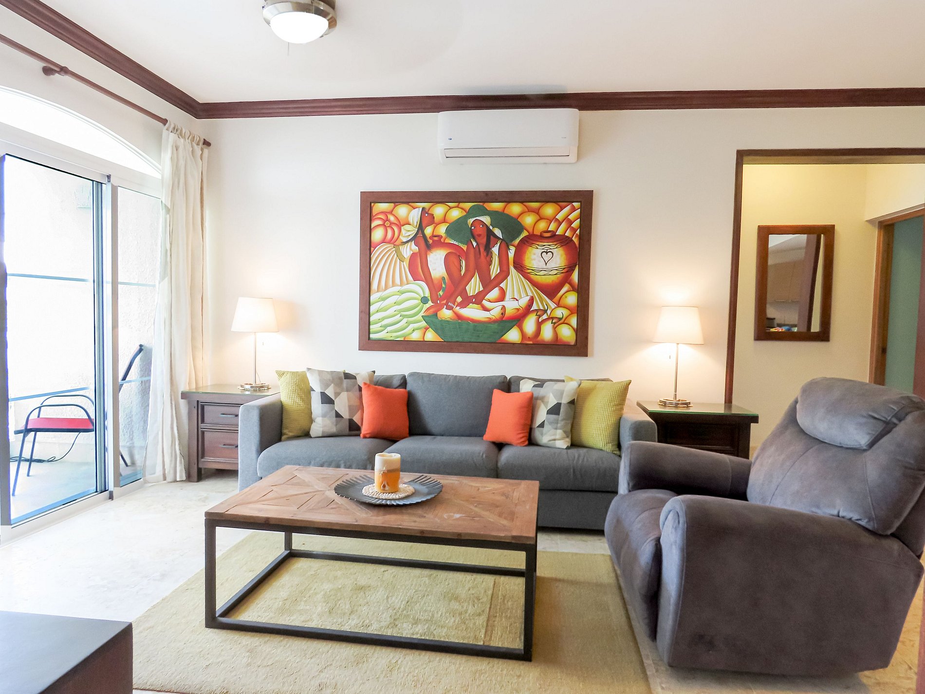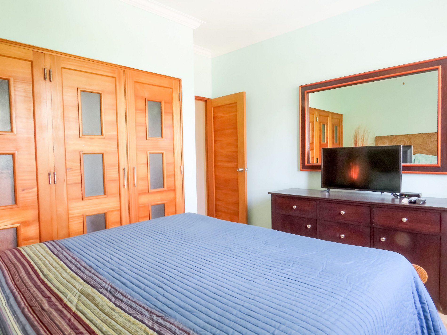 El apartamento cuenta con 2 recámaras y 2 baños, TV en sala y las habitaciones, aires acondicionados en todos los espacios y cocina equipada para hacer más cómoda su estadía.